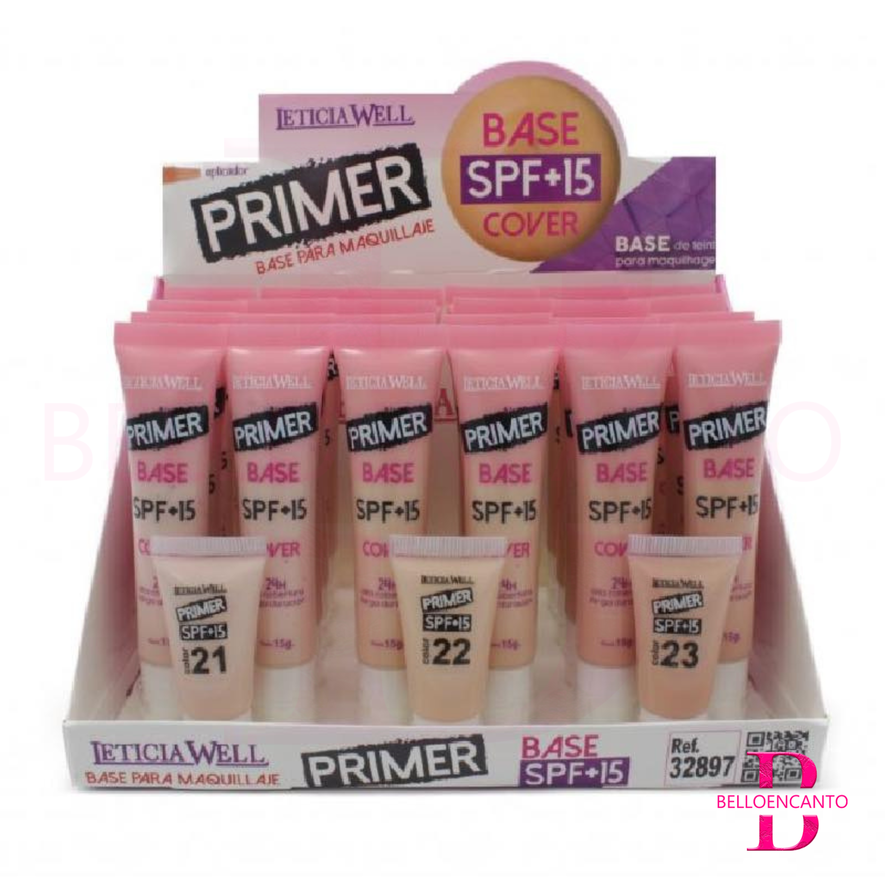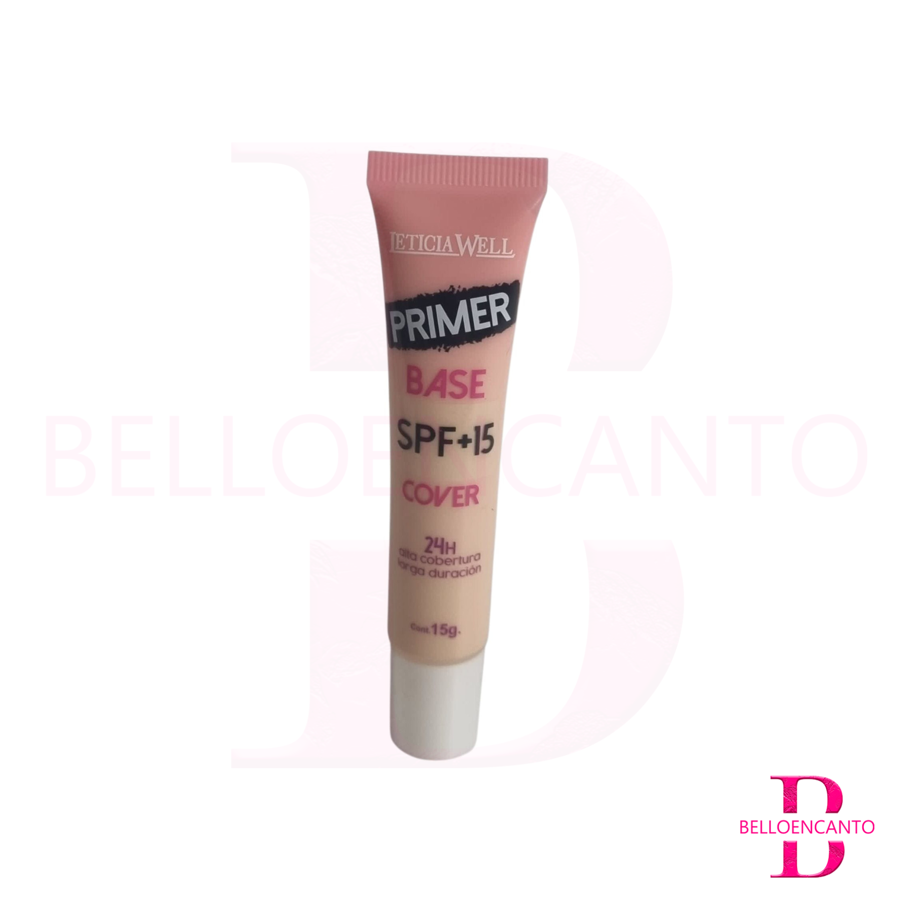 Leticia Well base maquillaje Primer base SPF+15 cover es de larga duración con SPF 15 y cobertura de 24 horas. Viene en 3 tonos diferentes para adaptarse a distintos tipos de piel. Esta base proporciona una cobertura uniforme y duradera, con protección solar, ideal para el día a día.