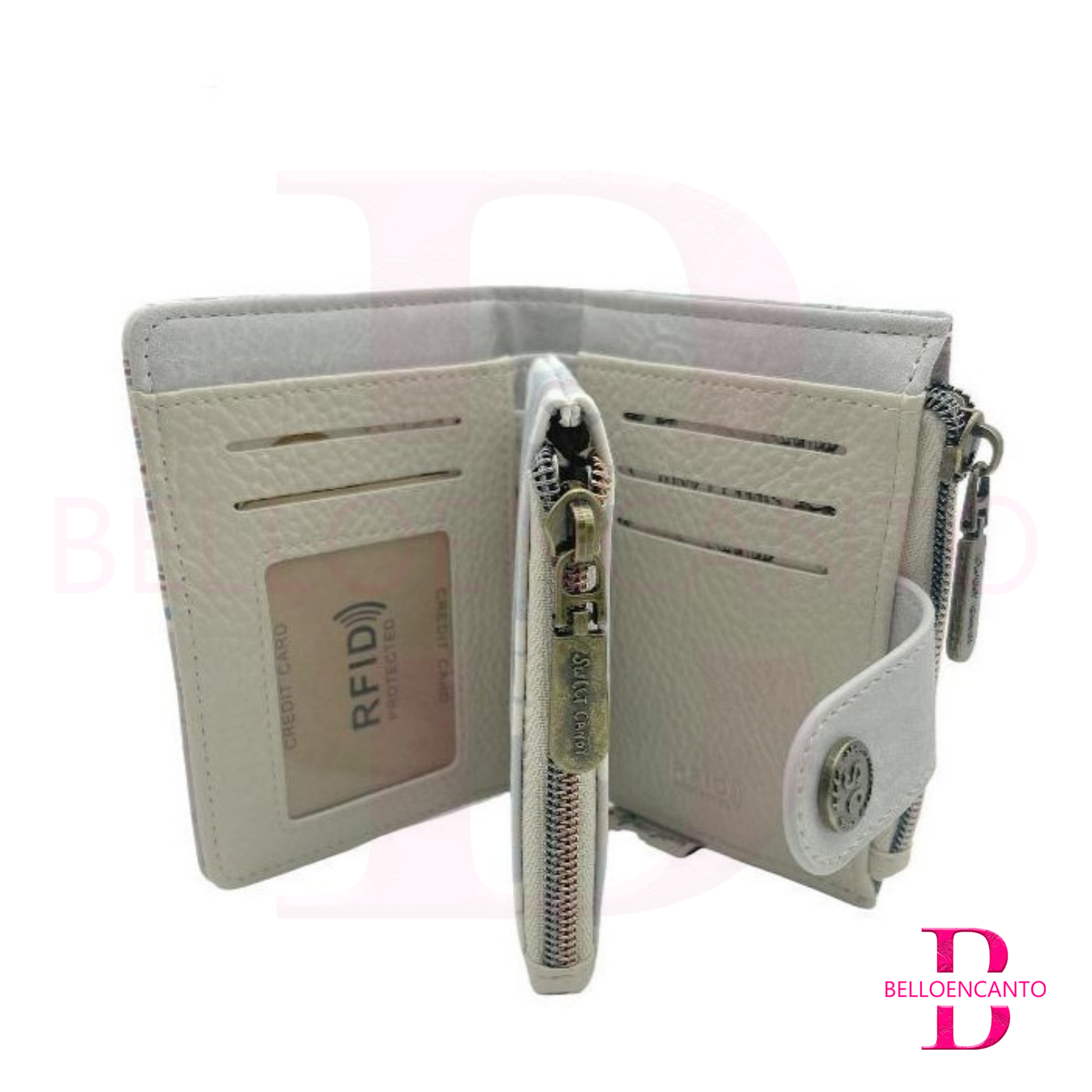 Está fabricado en polipiel o material sintético de alta calidad, es duradero. El cierre con cremallera da lugar a un compartimento único. La solapa de botón da lugar a un espacio para tarjetas, billetes y fotos. Además, tiene un bolsillo con cierre de cremallera para monedas.